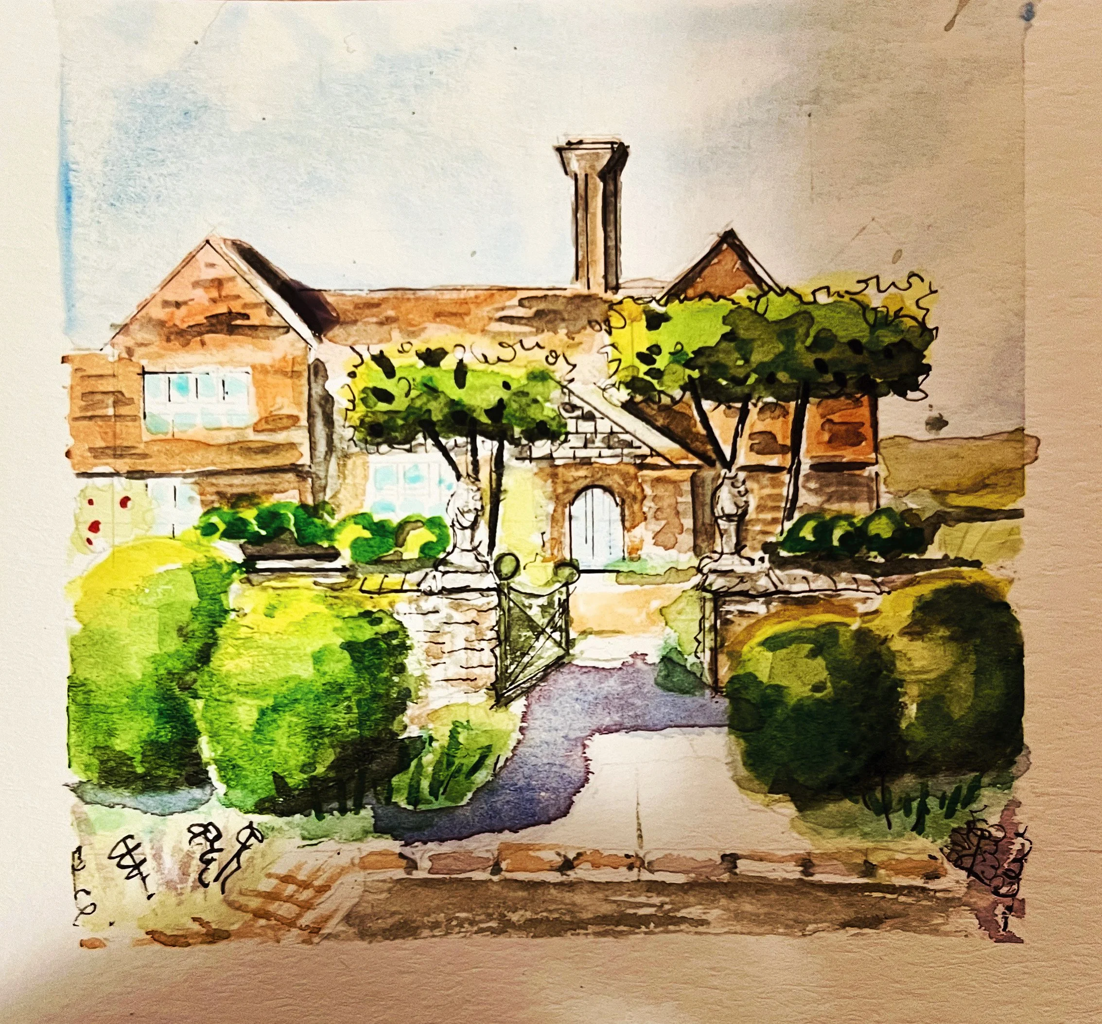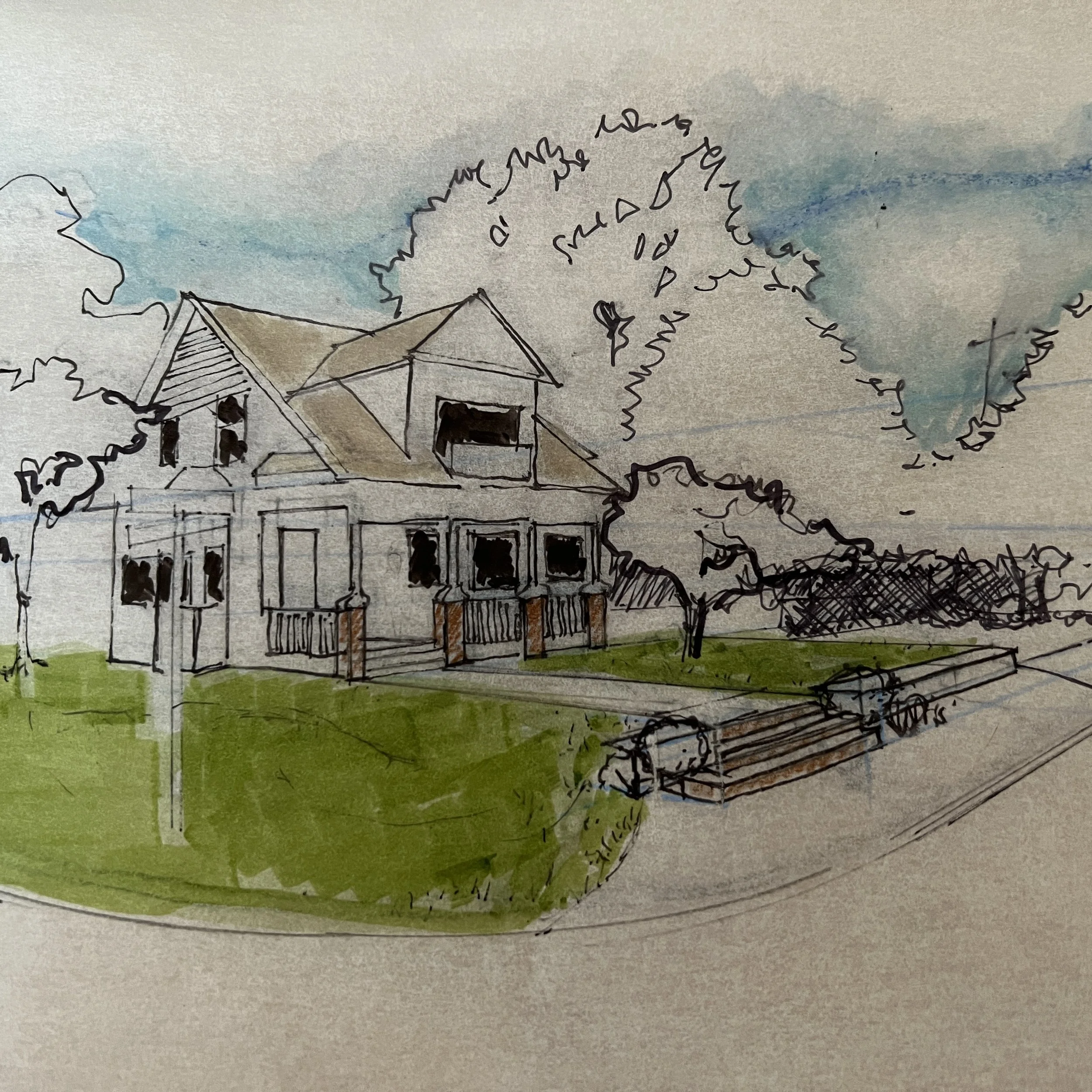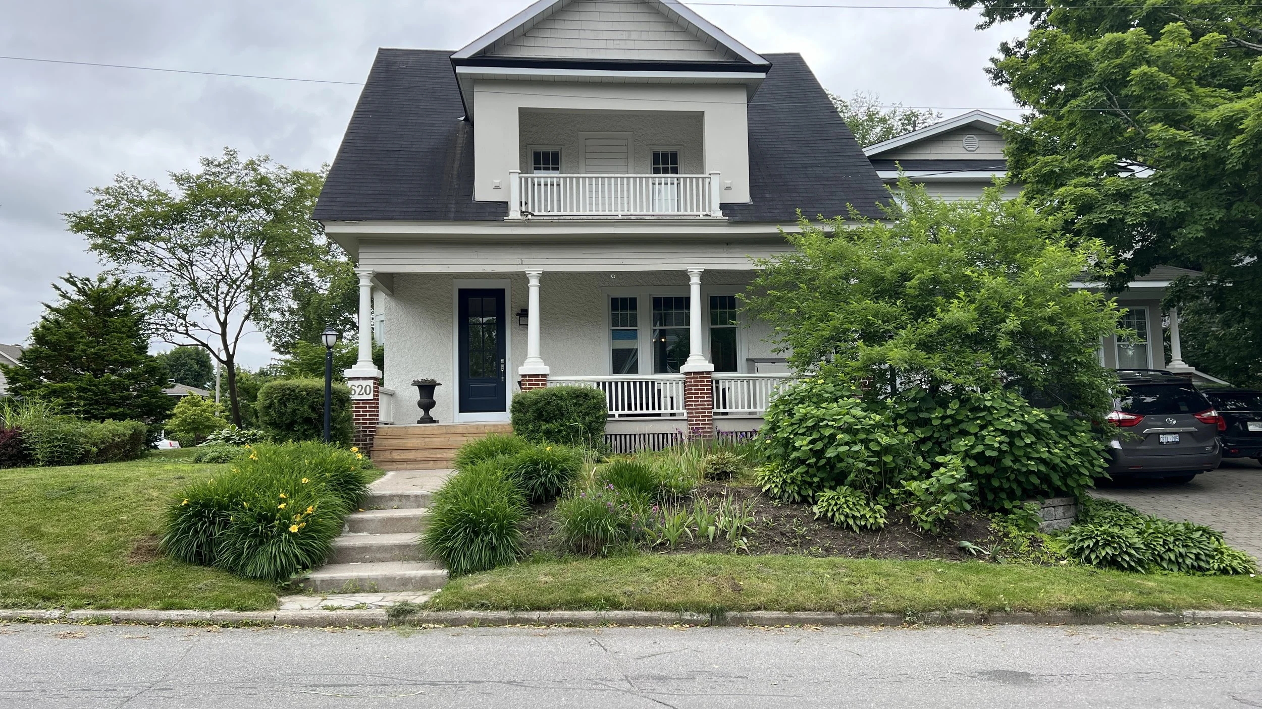 IMAGES: Clockwise from top left. Before image of front garden. Newly renovated front bed. Sketch of concept which includes lengthening and narrowing planting bed to elongate the lawn in front of porch. Rhythm of colonnade repeated by evergreen boxwoods.